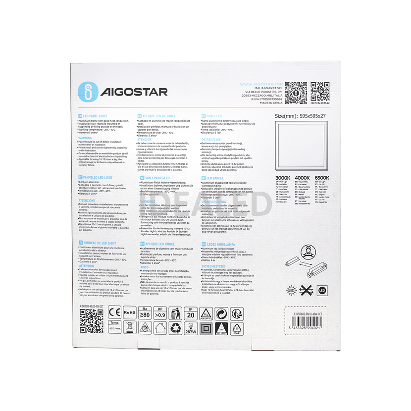 LED back-lit panel 600x600 s přepínáním barvy světla přímo na svítidle (CCT change), bílý rám, výkon 40W, světelný tok 5200 lm, barva světla volitelná 3000K až 6500K. Krytí panelu IP20. Instalace do kazetových podhledů. Životnost L70 min. 25.000 hodin.