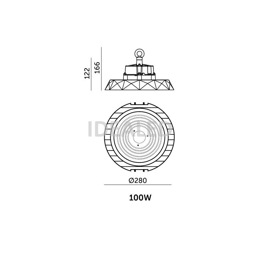 Špičkové LED průmyslové svítidlo s vysokou světelnou účinností 180 lm/W, výkon 100W. Krytí IP65. Světelný tok 18000 lm, barva světla 4000K. ZHAGA socket. Záruka 7 let. Životnost světelného zdroje L80 min. 70.000 hodin. Stmívatelný DALI driver. Barevné provedení černé. Použité čipy Philips SMD. Úhel světla 90°. Teplota prostředí: -30°C – +45°C.