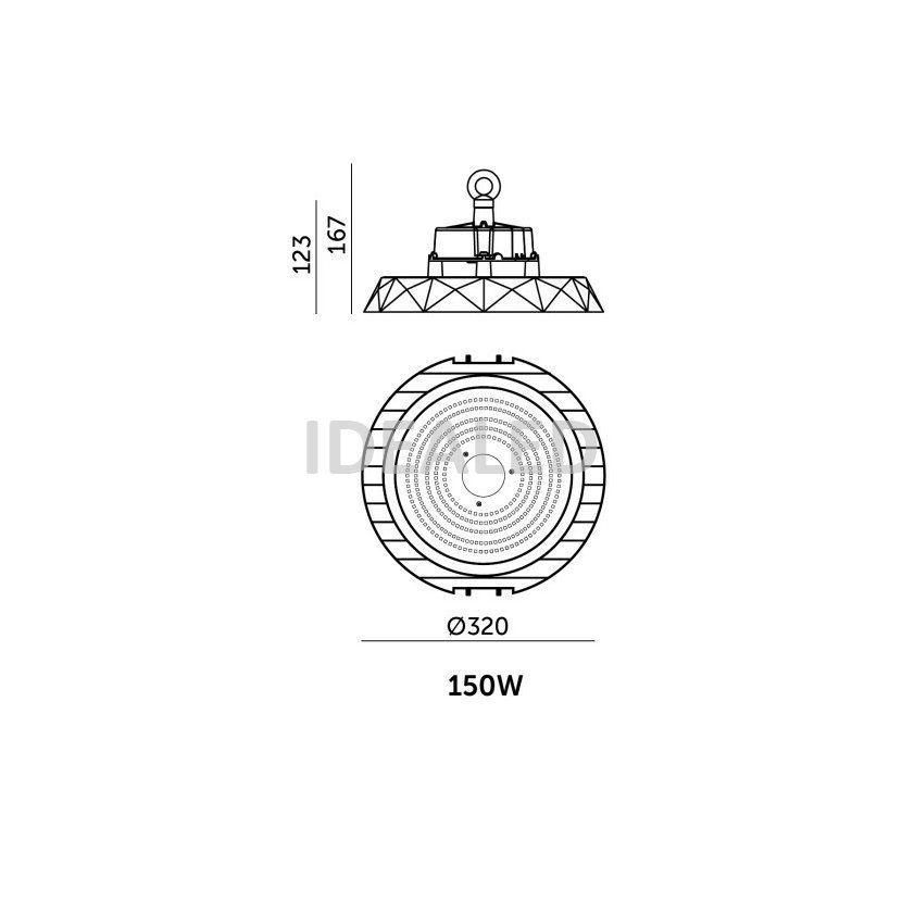 Špičkové LED průmyslové svítidlo s vysokou světelnou účinností 180 lm/W, výkon 150W. Krytí IP65. Světelný tok 27000 lm, barva světla 4000K. ZHAGA socket. Záruka 7 let. Životnost světelného zdroje L80 min. 70.000 hodin. Stmívatelný DALI driver. Barevné provedení černé. Použité čipy Philips SMD. Úhel světla 90°. Teplota prostředí: -30°C – +45°C.