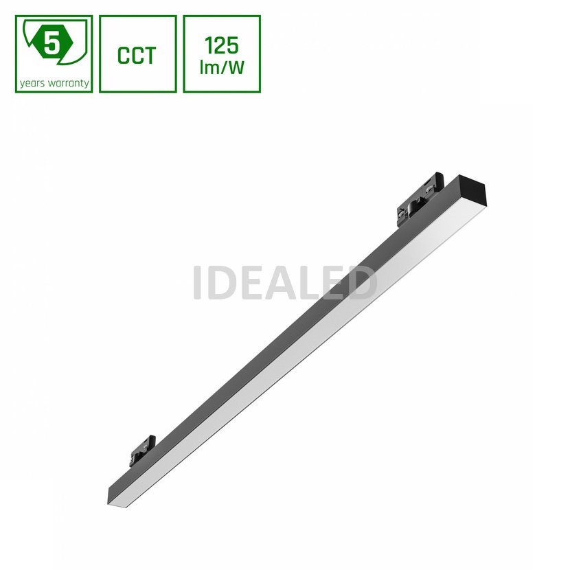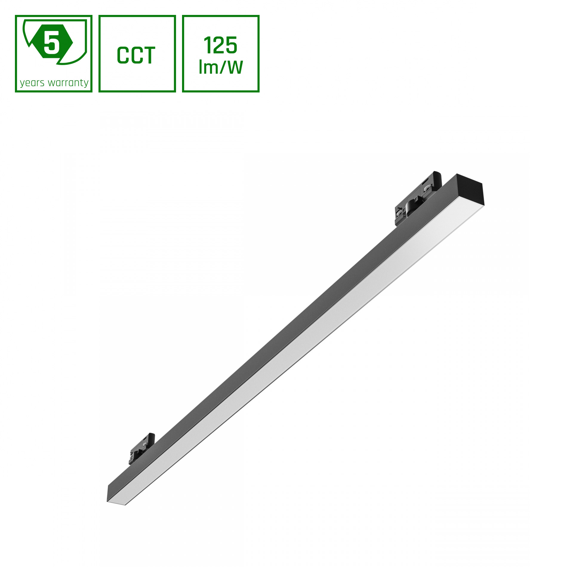 LED lineární tracking/lištové designové svítidlo, délka 1500 mm. Barva svítidla černá. Výkon 40W, světelný tok 6250 lm, barva světla přepínatelná na svítidle 3000K teplá bílá - 4000K neutrální bílá - 6000K studená bílá. Instalace do třífázové lišty. Vhodné pro osvětlení jídelen, obývacích pokojů, kanceláří, obchodů atd. Záruka 5 let.