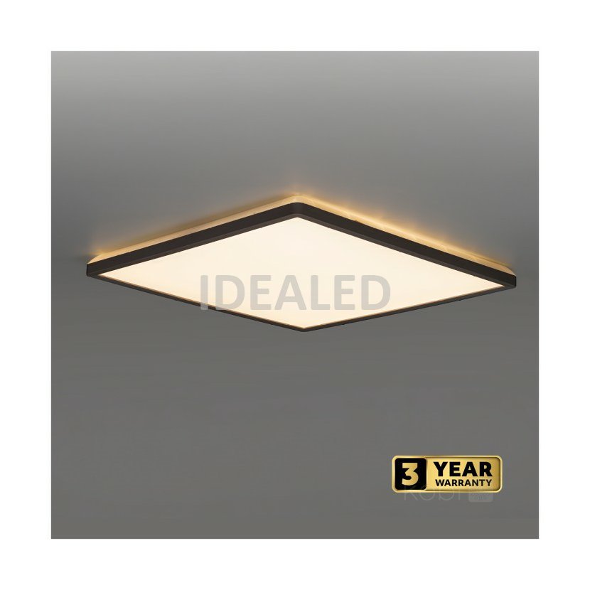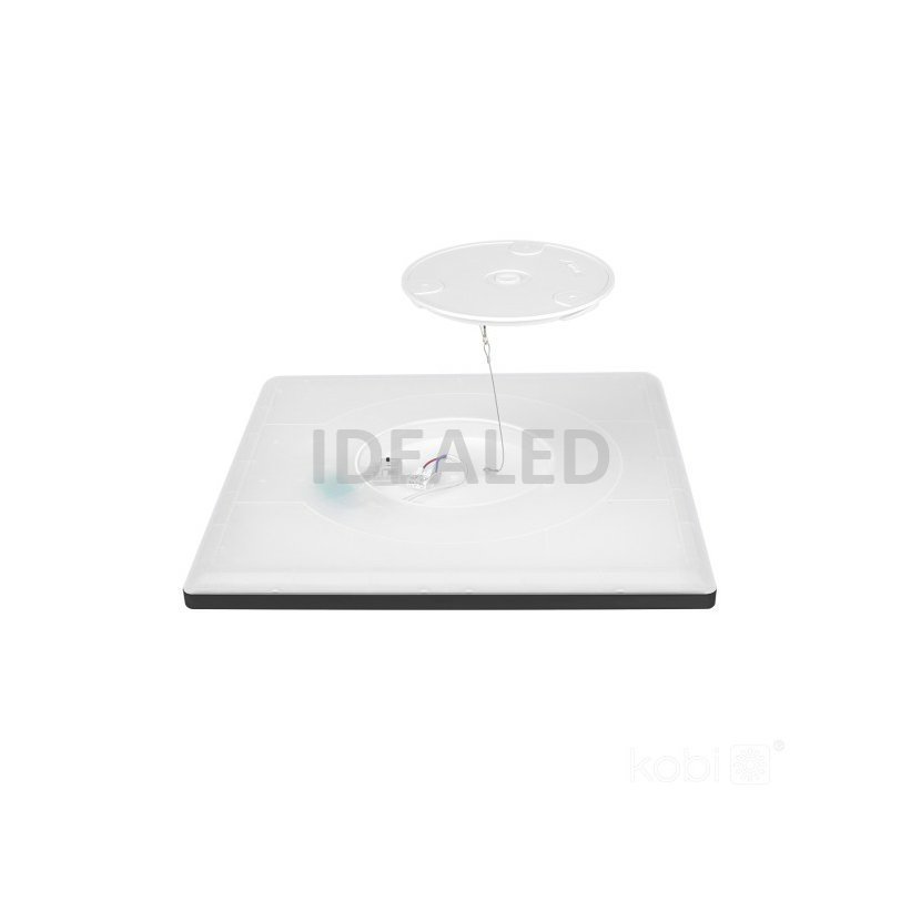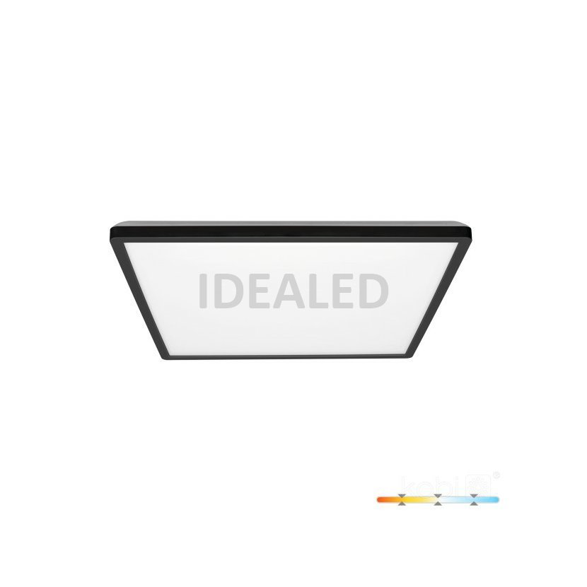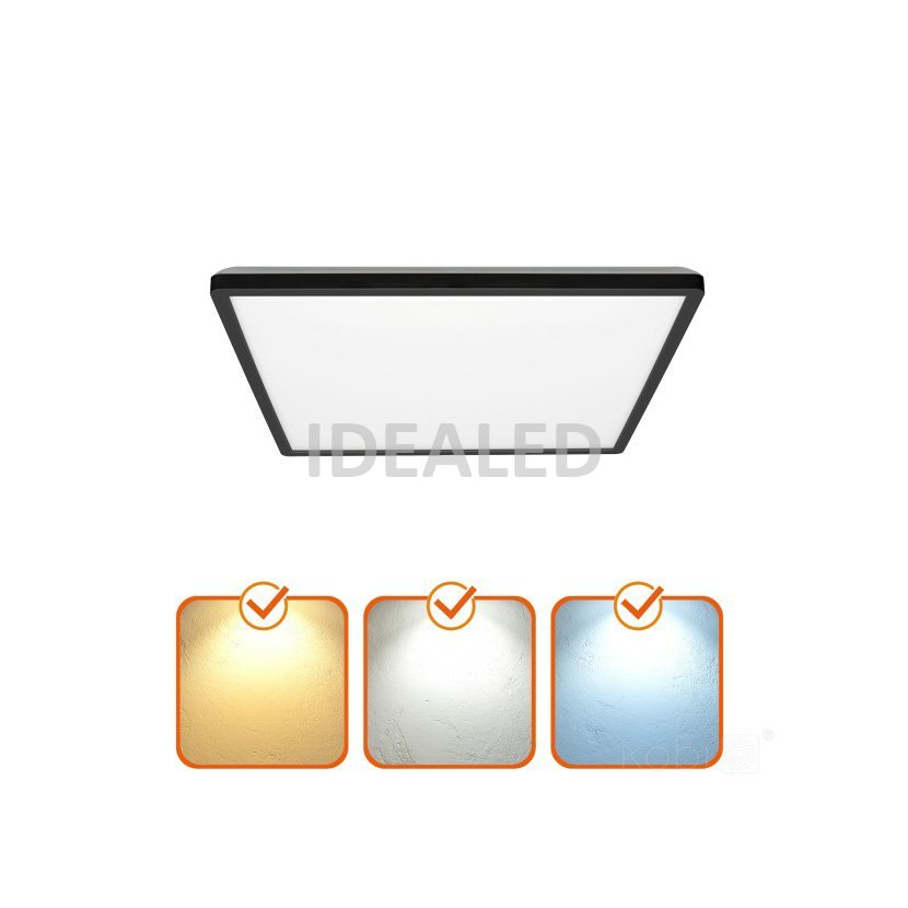 Přisazený LED mini panel, tvar čtverec, černý rám. Tenký design. Výkon 24W, světelný tok 2280 lm. Barva světla přepínatelná na zadní straně svítidla 3000K-4000K-6000K. Rozměry 300x300x28 mm. Krytí panelu IP54, vhodný pro instalaci do koupelny. Přisazená instalace. Záruka 3 roky.