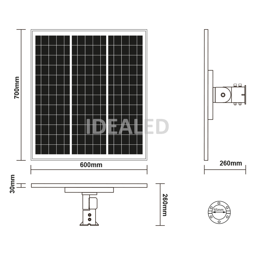 Solární panel: Pmpp 75W, monokrystal, Impp 4A, Vmpp 19V, Voc 22,8V, Isc 4,8A, pracovní teplota -20 - +45°C, rozměry 700x600x30 mm