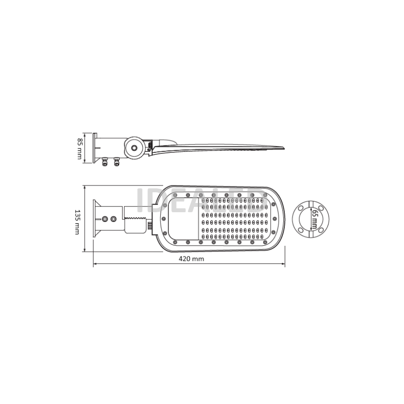 - Polykarbonátová optická čočka na každém LED čipu poskytuje rozptyl světla 140°×90° (typ T3, vhodný pro pouliční osvětlení a parkoviště);