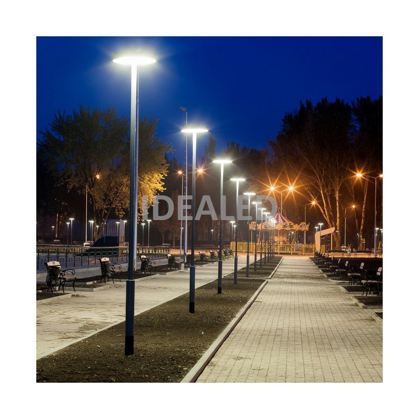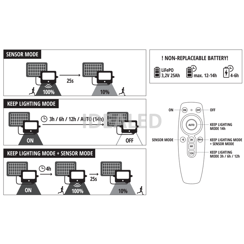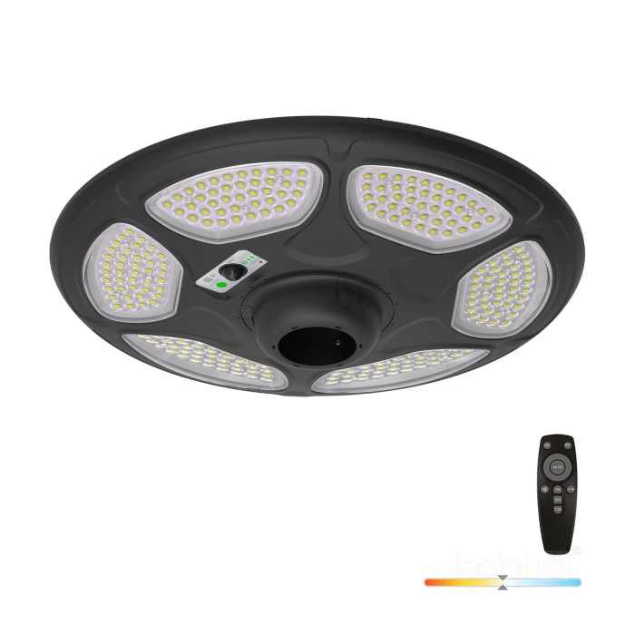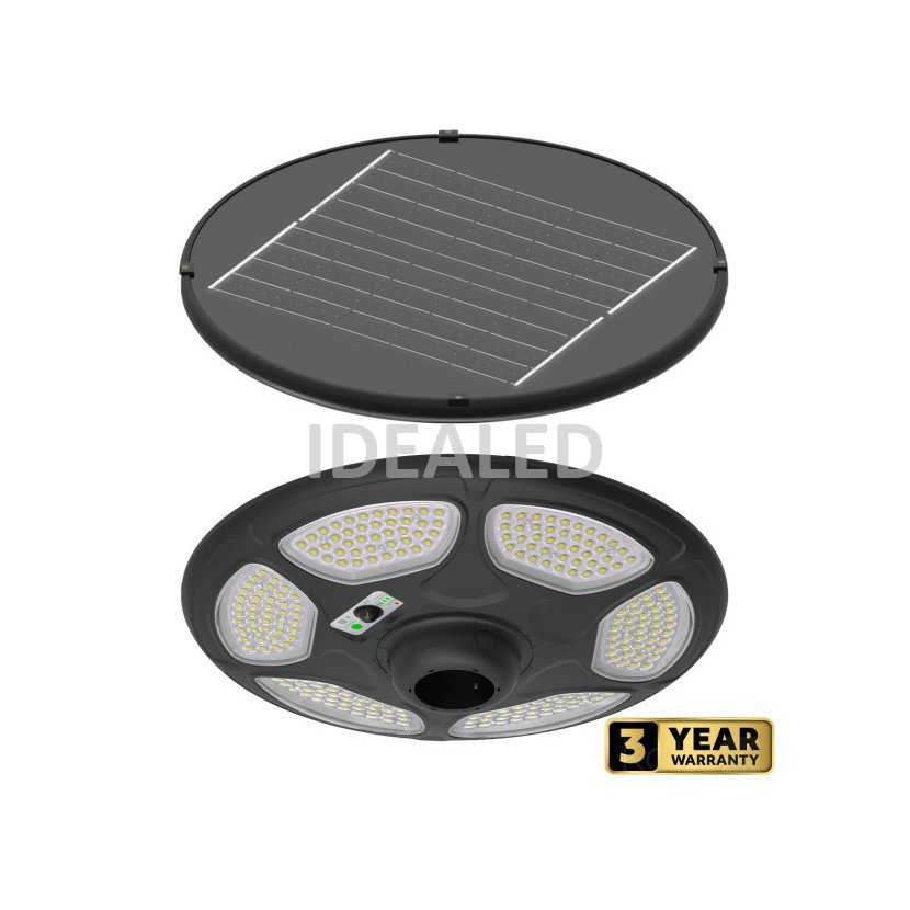 Parkové pouliční LED svítidlo s krytím IP54, výkon 25W. Solární svítidlo s integrovaným panelem a baterií. Integrované PIR čidlo. Dálkový ovladač. Světelný tok 3200 lm, barva světla 4000K. Záruka 3 roky. Životnost světelného zdroje L70 min. 25.000 hodin. Teplota prostředí: -10°C – +40°C.