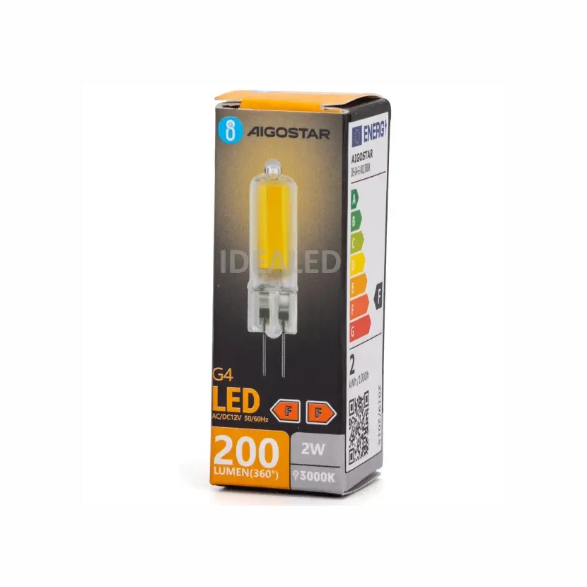 LED žárovka s paticí G4. Výkon 2W, barva světla 3000K, světelný tok 200 lm, úhel světla 360°. Náhrada za běžnou žárovku 15W. Napětí 12V AC/DC. COB technologie.