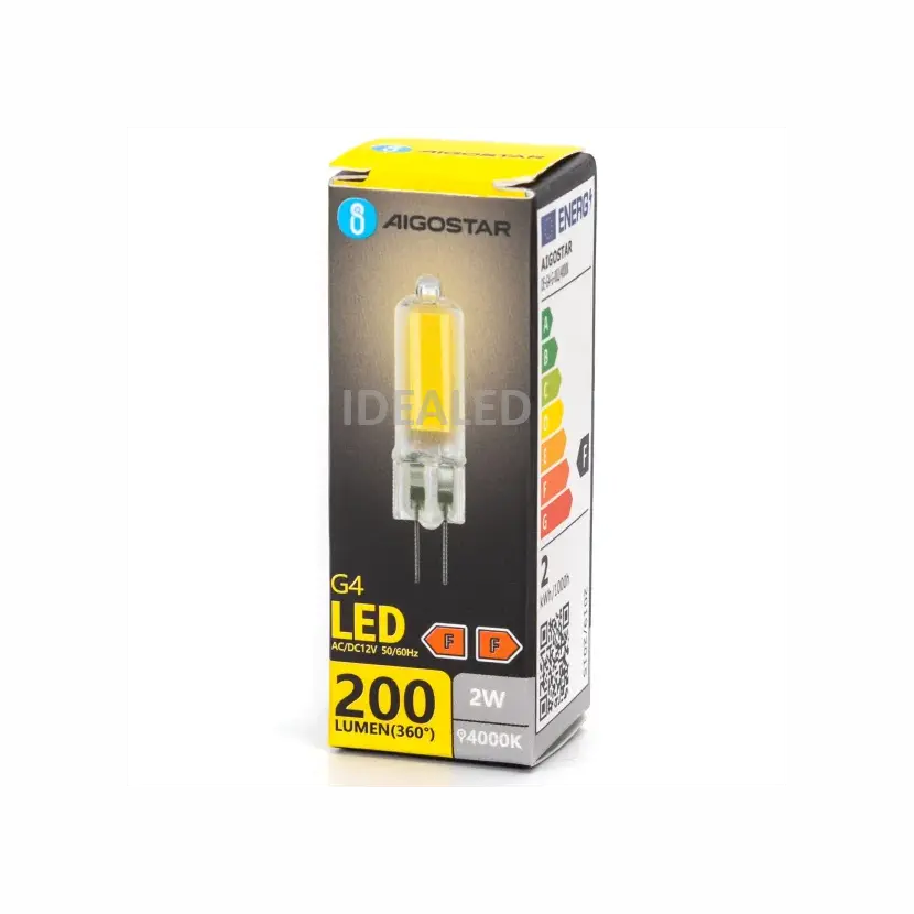 LED žárovka s paticí G4. Výkon 2W, barva světla 4000K, světelný tok 200 lm, úhel světla 360°. Náhrada za běžnou žárovku 15W. Napětí 12V AC/DC. COB technologie.